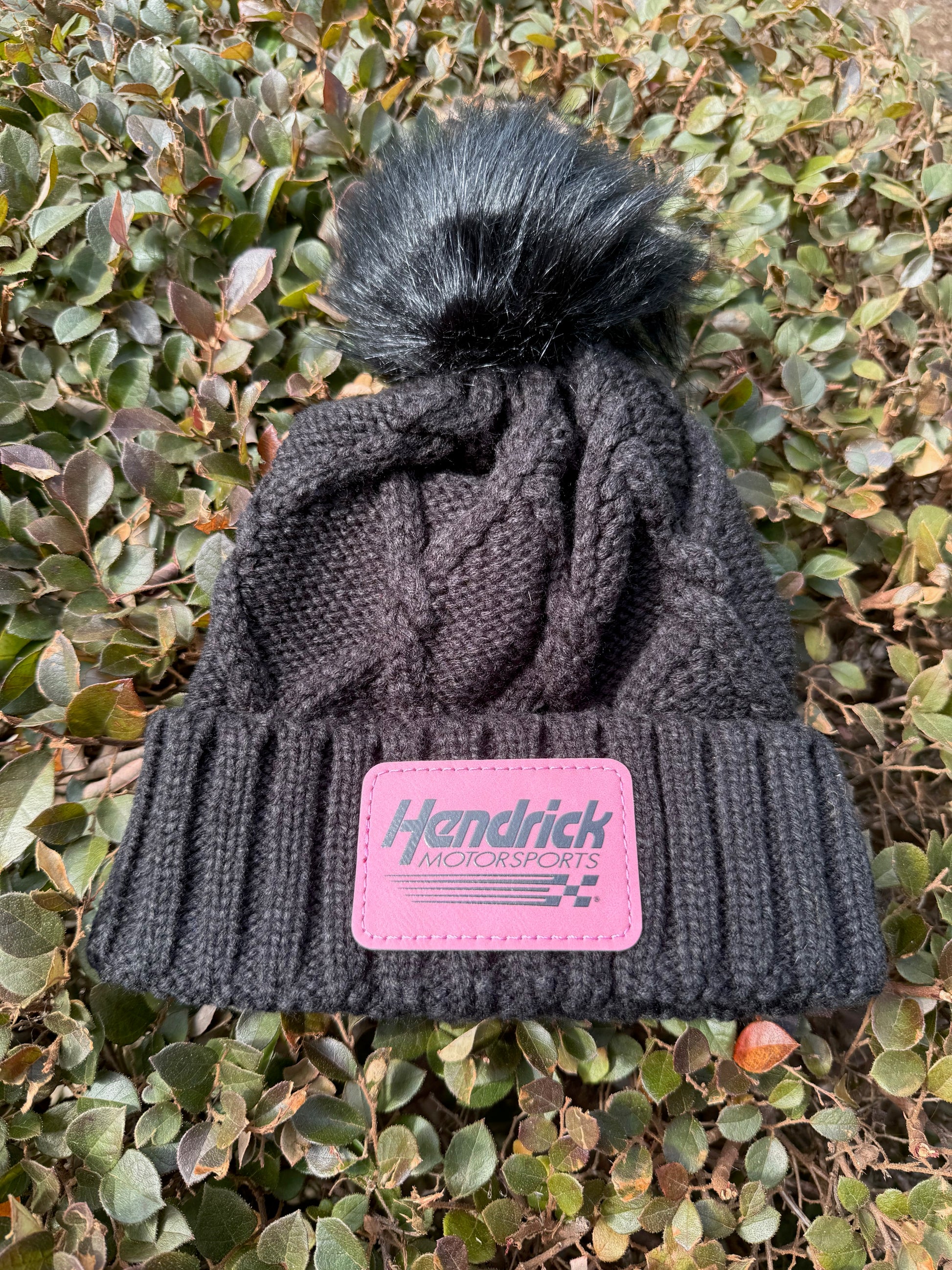 Black New Era Pom beanies - custom patches. White with full color HMS logo.